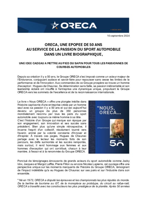 Depuis sa création il y a 50 ans, le Groupe ORECA s'est imposé comme un acteur majeur de l’Endurance, conjuguant audace et savoir-faire pour repousser sans cesse les limites de la performance et de l'innovation. Aux commandes de ce Groupe prospère se trouve un homme d'exception : Hugues de Chaunac. Sa détermination sans faille, sa passion inébranlable et son leadership éclairé ont insufflé à l'entreprise une dynamique unique, propulsant le Groupe