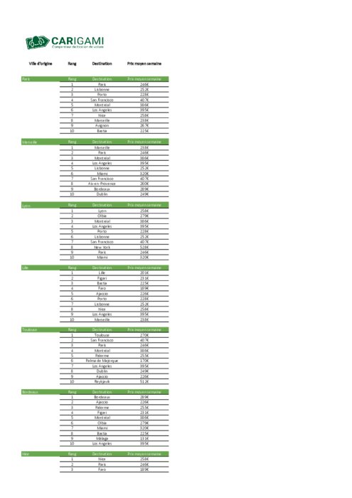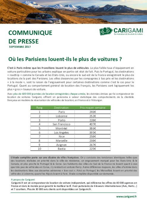 C'est à Paris que les Franciliens louent le plus de véhicules. Le plus faible taux d'équipement en voiture particulière pour les urbains explique en partie cet état de fait. Puis le Portugal, les destinations " roadtrip " comme le Canada et les Etats-Unis, ou encore le sud-est de la France enregistrent le plus de locations de la part des Parisiens. Les villes desservies par les compagnies à bas prix et les destinations " à la mode ", sont la raison de l'engouement pour certaines destinations.