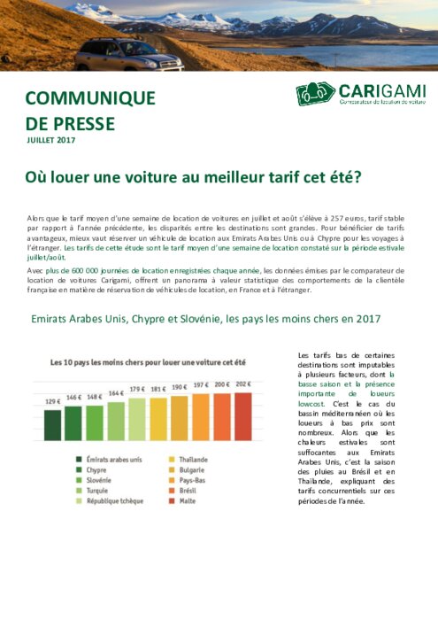 Alors que le tarif moyen d'une semaine de location de voitures en juillet et août s'élève à 257 euros, tarif stable par rapport à l'année précédente, les disparités entre les destinations sont grandes. Pour bénéficier de tarifs avantageux, mieux vaut réserver un véhicule de location aux Emirats Arabes Unis ou à Chypre pour les voyages à l'étranger. Les tarifs de cette étude sont le tarif moyen d'une semaine de location constaté sur la période estivale juillet/août.