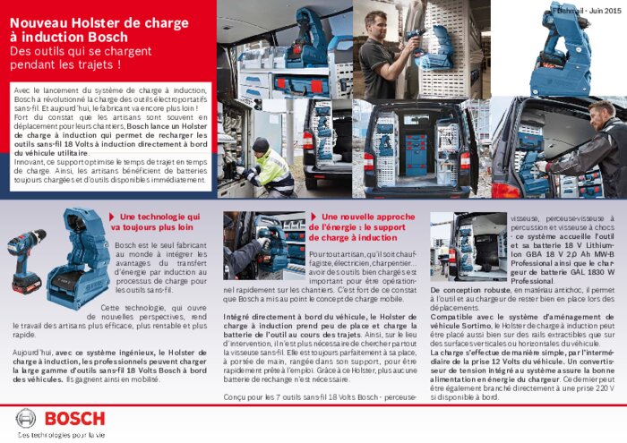 Fort du constat que les artisans sont souvent en déplacement pour leurs chantiers, Bosch lance un Holster de charge à induction qui permet de recharger les outils sans-fil 18 Volts à induction directement à bord du véhicule utilitaire.