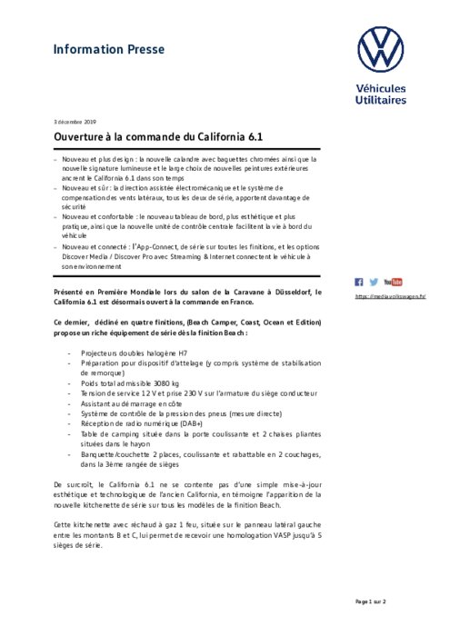 Présenté en Première Mondiale lors du salon de la Caravane à Düsseldorf, le California 6.1 est désormais ouvert à la commande en France. Ce dernier, décliné en quatre finitions, (Beach Camper, Coast, Ocean et Edition) propose un riche équipement de série dès la finition Beach...
