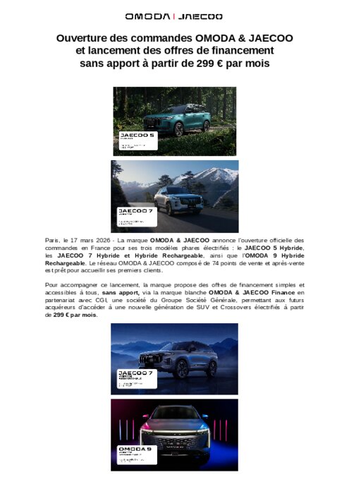 La marque Omoda & Jaecoo annonce l’ouverture officielle des commandes en France pour ses trois modèles phares électrifiés : le Jaecoo 5 Hybride, les Jaecoo 7 Hybride et Hybride Rechargeable, ainsi que l'Omoda 9 Hybride Rechargeable. Le réseau Omoda & Jaecco composé de 74 points de vente et après-vente est prêt pour accueillir ses premiers clients.