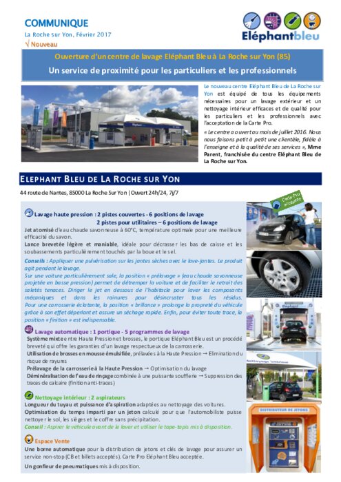 Le nouveau centre Eléphant Bleu de La Roche sur Yon est équipé de tous les équipements nécessaires pour un lavage extérieur et un nettoyage intérieur efficaces et de qualité pour les particuliers et les professionnels avec l’acceptation de la Carte Pro. " Le centre a ouvert au mois de juillet 2016. Nous nous faisons petit à petit une clientèle, fidèle à l’enseigne et à la qualité de ses services ", Mme Parent, franchisée du centre Eléphant Bleu de La Roche sur Yon.