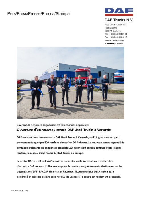 DAF a ouvert un nouveau centre DAF Used Trucks à Varsovie, en Pologne, avec un parc permanent de quelque 500 camions d'occasion DAF récents. Le nouveau centre répond à la demande croissante de camions d’occasion DAF récents en Europe centrale et de l'Est et renforce le réseau Used Trucks de DAF Trucks en Europe.