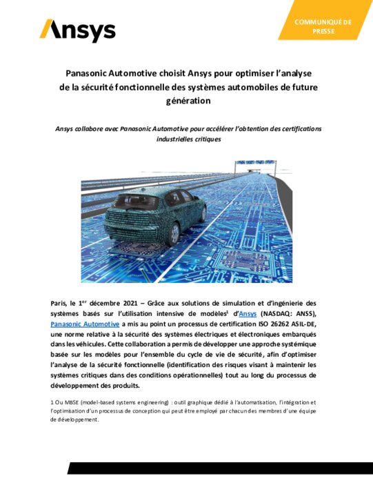 Grâce aux solutions de simulation et d’ingénierie des systèmes basés sur l’utilisation intensive de modèles1 d’Ansys (NASDAQ: ANSS), Panasonic Automotive a mis au point un processus de certification ISO 26262 ASIL-DE, une norme relative à la sécurité des systèmes électriques et électroniques embarqués dans les véhicules. Cette collaboration a permis de développer une approche systémique basée sur les modèles pour l’ensemble du cycle de vie de sécurité, afin d’optimiser l’analyse de la sécurité fonctionnelle (identification des risques visant à maintenir les systèmes critiques dans des conditions opérationnelles) tout au long du processus de développement des produits.