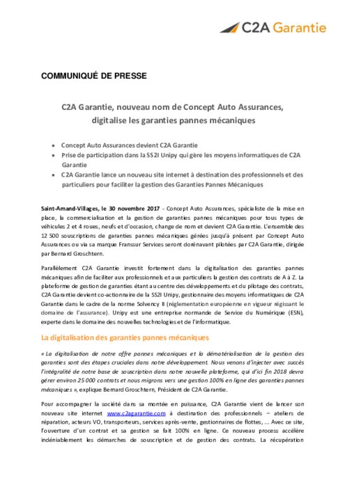 Concept Auto Assurances, spécialiste de la mise en place, la commercialisation et la gestion de garanties pannes mécaniques pour tous types de véhicules 2 et 4 roues, neufs et d'occasion, change de nom et devient C2A Garantie. L'ensemble des 12 500 souscriptions de garanties pannes mécaniques gérées jusqu'à présent par Concept Auto Assurances ou via sa marque Franssur Services seront dorénavant pilotées par C2A Garantie, dirigée par Bernard Groschtern.