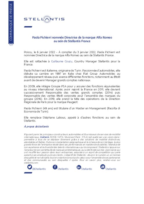 À compter du 3 janvier 2022, Paola Pichierri est nommée Directrice de la marque Alfa Romeo au sein de Stellantis France. Elle est rattachée à Guillaume Couzy, Country Manager Stellantis pour la France.
