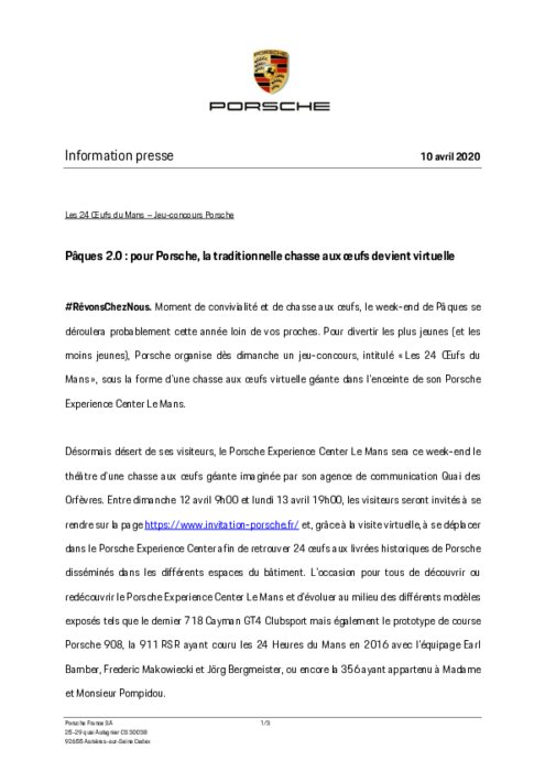 #RêvonsChezNous. Moment de convivialité et de chasse aux œufs, le week-end de Pâques se déroulera probablement cette année loin de vos proches. Pour divertir les plus jeunes (et les moins jeunes), Porsche organise dès dimanche un jeu-concours, intitulé " Les 24 Œufs du Mans ", sous la forme d'une chasse aux œufs virtuelle géante dans l'enceinte de son Porsche Experience Center Le Mans.