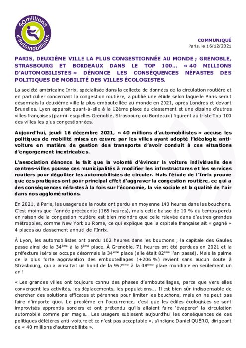 Jeudi 16 décembre 2021, « 40 millions d’automobilistes » a accusé les politiques de mobilité mises en œuvre par les villes ayant adopté l’idéologie antivoiture en matière de gestion des transports d’avoir conduit à ces situations d’engorgement inextricables.