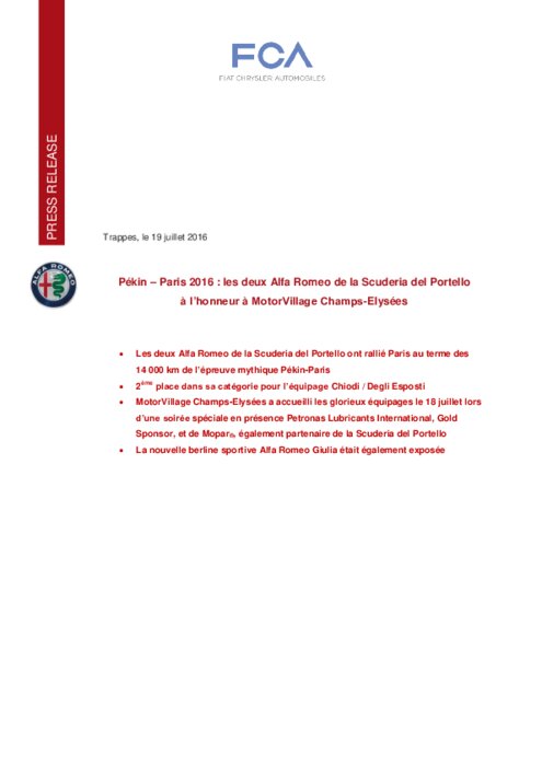 Au terme d’un extraordinaire et périlleux parcours de près de 14.000 kilomètres à travers 11 pays, les deux Alfa Romeo Giulia historiques de la Scuderia del Portello ont rallié la prestigieuse Place Vendôme à Paris le dimanche 17 juillet après 36 jours de course et avec à la clé une 2ème place dans sa catégorie pour la Giulia de R. Chiodi et MR. Degli Esposti.