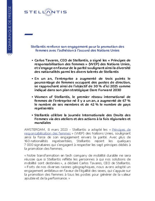 Stellantis a adopté les « Principes de responsabilisation des femmes » (WEP) des Nations Unies, soulignant ainsi la force de son engagement envers la parité. Avec plus de 160 nationalités représentées, Stellantis rejoint les quelques 7 000 signataires qui s’engagent à respecter les sept principes dédiés à la promotion des femmes.