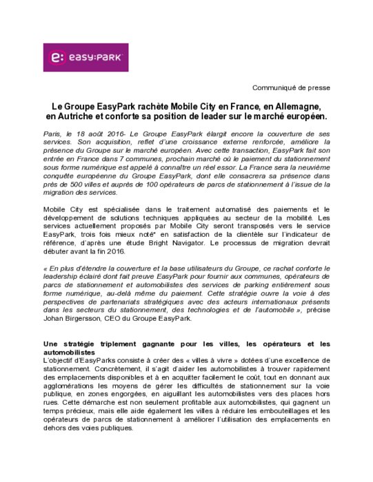 Le Groupe EasyPark élargit encore la couverture de ses services. Son acquisition, reflet d’une croissance externe renforcée, améliore la présence du Groupe sur le marché européen. Avec cette transaction, EasyPark fait son entrée en France dans 7 communes, prochain marché où le paiement du stationnement sous forme numérique est appelé à connaître un réel essor. La France sera la neuvième conquête européenne du Groupe EasyPark, dont elle consacrera sa présence dans près de 500 villes.