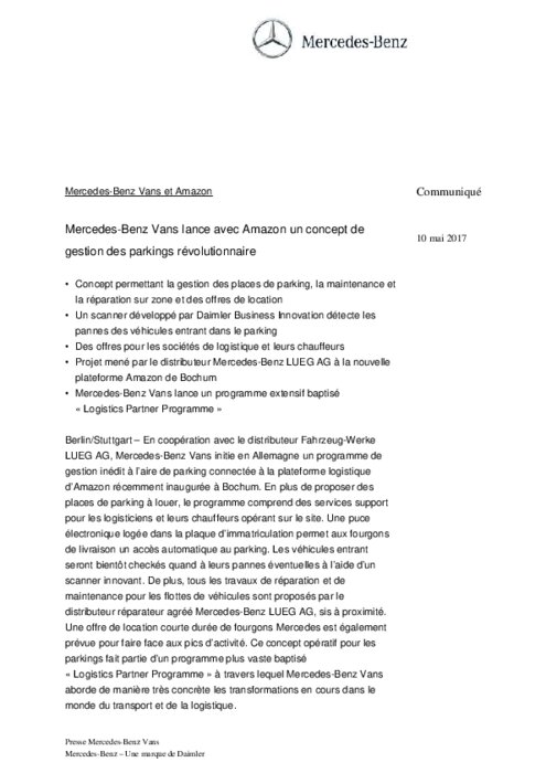 En coopération avec le distributeur Fahrzeug-Werke LUEG, Mercedes-Benz Vans initie en Allemagne un programme de gestion à l’aire de parking connectée à la plateforme logistique d’Amazon récemment inaugurée à Bochum. En plus de proposer des places de parking à louer, le programme comprend des services support pour les logisticiens et leurs chauffeurs opérant sur le site. Une puce électronique logée dans la plaque d’immatriculation permet aux fourgons de livraison un accès automatique au parking.