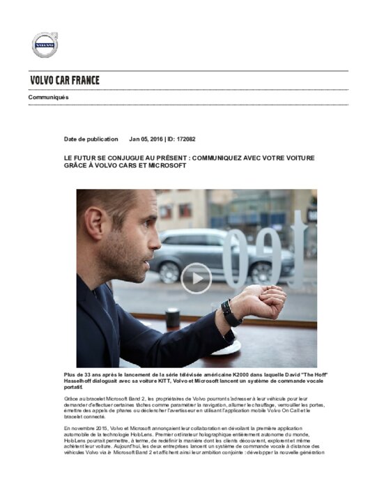 Constructeurs 05 janvier 2016 - 15:32 Plus de 33 ans après le lancement de la série télévisée américaine K2000 dans laquelle David Hasselhoff dialoguait avec sa voiture KITT, Volvo et Microsoft lancent un système de commande vocale portatif. PDF (171 Ko) Télécharger