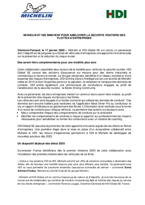 Equipementiers 17 janvier 2020 - 11:54 Michelin et HDI Global SE ont conclu un partenariat dont l'objectif est de proposer aux flottes de véhicules d'entreprises une approche innovante axée sur la prévention et la réduction du risque routier. PDF (160 Ko) Télécharger