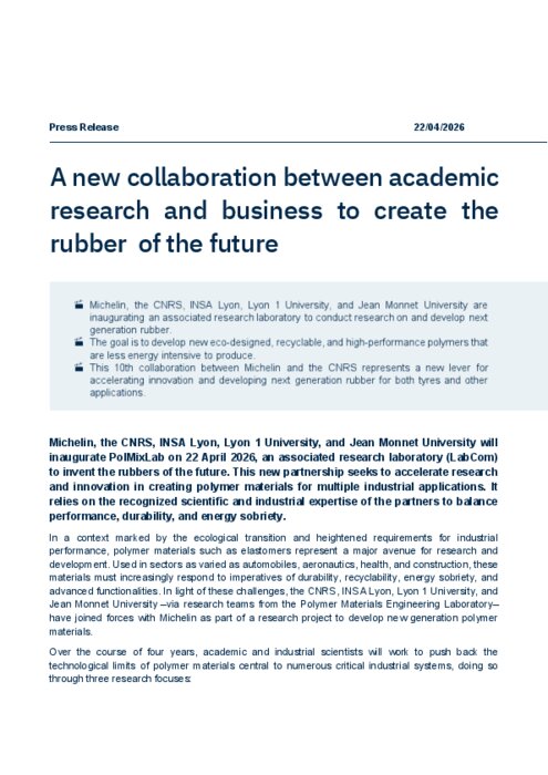 Michelin, le CNRS, l'INSA Lyon, l'université Lyon 1 et l'université Jean Monnet ont inauguré le 22 avril 2026 le PolMixLab, un laboratoire de recherche associé (LabCom) dédié à la conception des caoutchoucs de demain. Ce nouveau partenariat vise à accélérer la recherche et l'innovation dans le domaine de la création de matériaux polymères destinés à de multiples applications industrielles. Il s'appuie sur l'expertise scientifique et industrielle reconnue des partenaires pour trouver le juste équilibre entre performance, durabilité et sobriété énergétique.