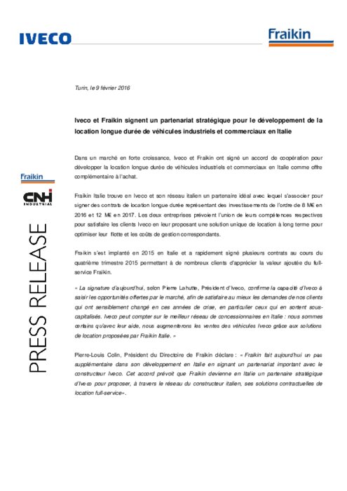 Constructeurs 10 février 2016 - 15:33 Iveco et Fraikin signent un partenariat stratégique pour le développement de la location longue durée de véhicules industriels et commerciaux en Italie dans un marché en forte croissance. PDF (181 Ko) Télécharger