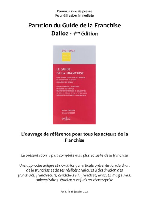 Charlotte BELLET, avocat au barreau de Paris, et Nicolas DISSAUX, professeur des universités, tous 2 spécialistes et praticiens du droit de la distribution depuis 25 ans, cosignent le Guide Dalloz de la Franchise. Cette bible aborde l'ensemble des questions liées à la franchise : la rencontre entre franchisé et franchiseur, le contrat, les relations entre les parties, les relations entre franchisés, la fin du contrat, les conflits, mais également la franchise en temps de crise...