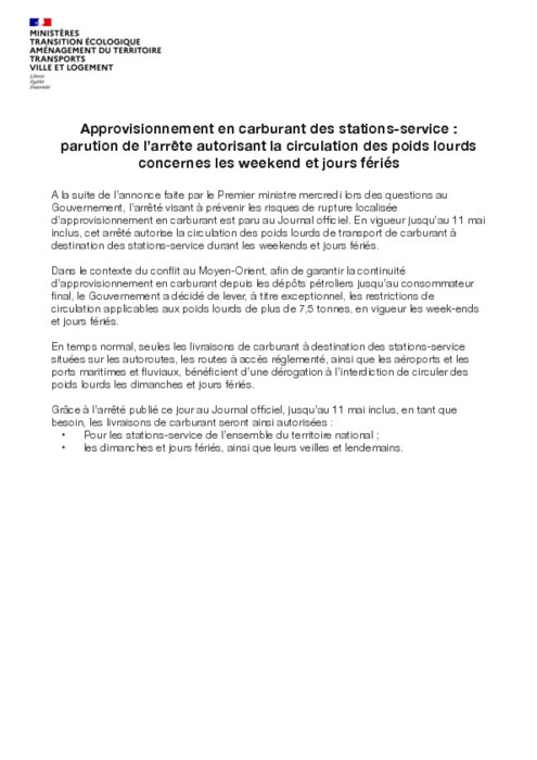 A la suite de l’annonce faite par le Premier ministre mercredi lors des questions au Gouvernement, l’arrêté visant à prévenir les risques de rupture localisée d’approvisionnement en carburant est paru au Journal officiel. En vigueur jusqu’au 11 mai inclus, cet arrêté autorise la circulation des poids lourds de transport de carburant à destination des stations-service durant les weekends et jours fériés.