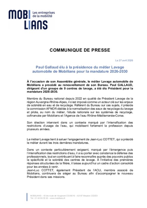 Services 27 avril 2026 - 12:56 A l’occasion de son Assemblée générale, le métier Lavage automobile de Mobilians a procédé au renouvellement de son Bureau. Paul GALLAUD, dirigeant d’un groupe de 9 centres de lavage, a été élu Président pour la mandature 2026-2030. PDF (222 Ko) Télécharger crédit Paul Gallaud