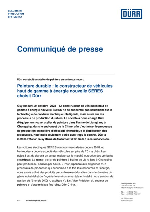 Peinture durable : le constructeur Seres choisit Dürr