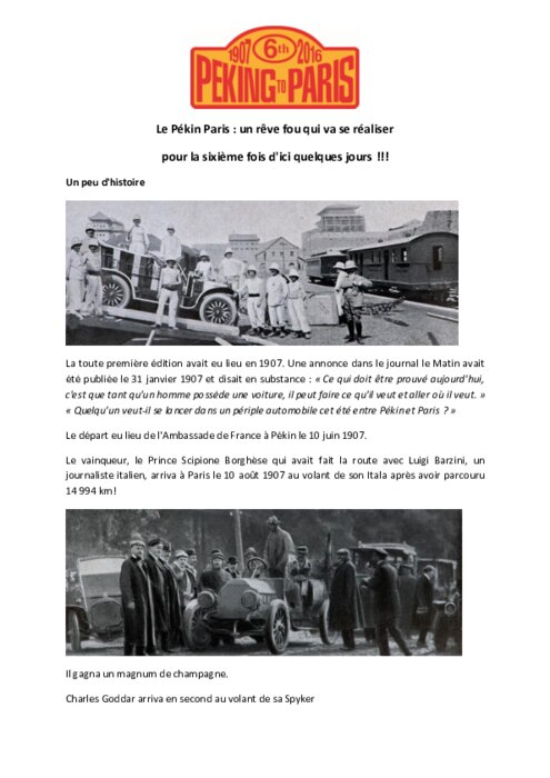 La sixième édition du rallye Pékin-Paris sera lancée d'ici quelques jours. Le 12 juin prochain à 8h00 du matin, 112 voitures s'élanceront de la Grande Muraille de Chine tout près de Pékin. 50 d'entre elles sont d'avant 1942 et la plus vieille d'entre elles est une la France de 1915 pilotée par Steve et Katherine Trafton (USA), 24 pays sont représentés, y compris la France !