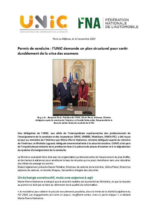 Une délégation de l’UNIC, aux côtés de l’intersyndicale représentative des professionnels de l’enseignement de la conduite et des inspecteurs (UNIC, UNIDEC, Mobilians, SNICA-FO), a été reçue ce jour au ministère de l’Intérieur par Marie-Pierre Vedrenne, ministre déléguée auprès du ministre de l’Intérieur, et Michèle Lugrand, déléguée interministérielle à la sécurité routière. L’UNIC a fait part de l’inquiétude persistante de la profession face à la pénurie de places d’examen et à la dégradation du système d’enseignement de la conduite.