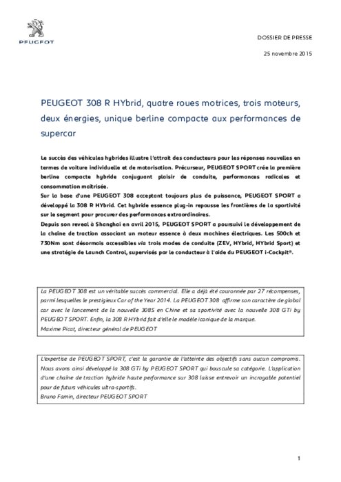 Le succès des véhicules hybrides illustre l’attrait des conducteurs pour les réponses nouvelles en termes de voiture individuelle et de motorisation. Précurseur, PEUGEOT SPORT crée la première berline compacte hybride conjuguant plaisir de conduite, performances radicales et consommation maîtrisée. Sur la base d’une PEUGEOT 308 acceptant toujours plus de puissance, PEUGEOT SPORT a développé la 308 R HYbrid. Cet hybride essence plug-in repousse les frontières de la sportivité sur le segment.