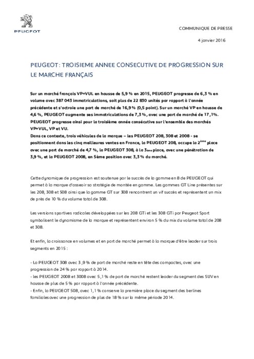 Sur un marché français VP+VUL en hausse de 5,9 % en 2015, PEUGEOT progresse de 6,3 % en volume avec 387 043 immatriculations, soit plus de 22 830 unités par rapport à l’année précédente et s’octroie une part de marché de 16,9 % (0,5 point). Sur un marché VP en hausse de 4,6 %, PEUGEOT augmente ses immatriculations de 7,3 %, avec une part de marché de 17 ,1%. PEUGEOT progresse ainsi pour la troisième année consécutive sur l’ensemble des marchés VP+VUL, VP et VU.