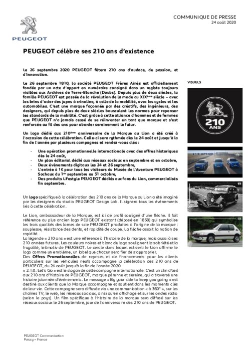 Le 26 septembre 2020 PEUGEOT fêtera 210 ans d'audace, de passion, et d'innovation. Le 26 septembre 1810, la société PEUGEOT Frères Aînés est officiellement fondée par un acte d'apport en numéraire consigné dans un registe toujours visibles aux Archives de Terre-Blanche (Doubs). Depuis plus de deux siècles, la famille PEUGEOT est passée de la révolution de la mode au XIXème siècle - avec les brins d'acier des jupes à crinoline, à celle de la mobilité, avec les cycles et les