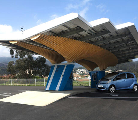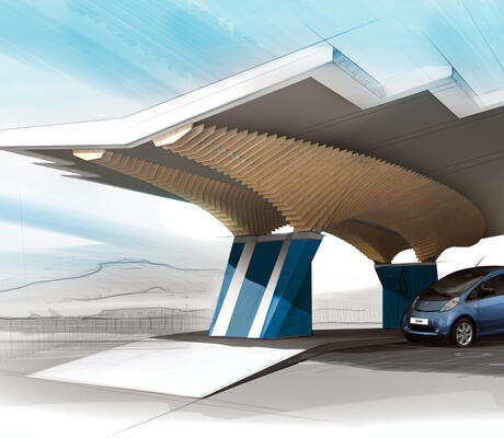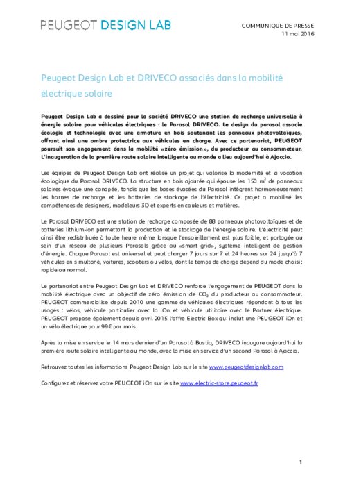 Peugeot Design Lab a dessiné pour la société DRIVECO une station de recharge universelle à énergie solaire pour véhicules électriques : le Parasol DRIVECO. Le design du parasol associe écologie et technologie avec une armature en bois soutenant les panneaux photovoltaïques, offrant ainsi une ombre protectrice aux véhicules en charge. Avec ce partenariat, PEUGEOT poursuit son engagement dans la mobilité " zéro émission ", du producteur au consommateur.
