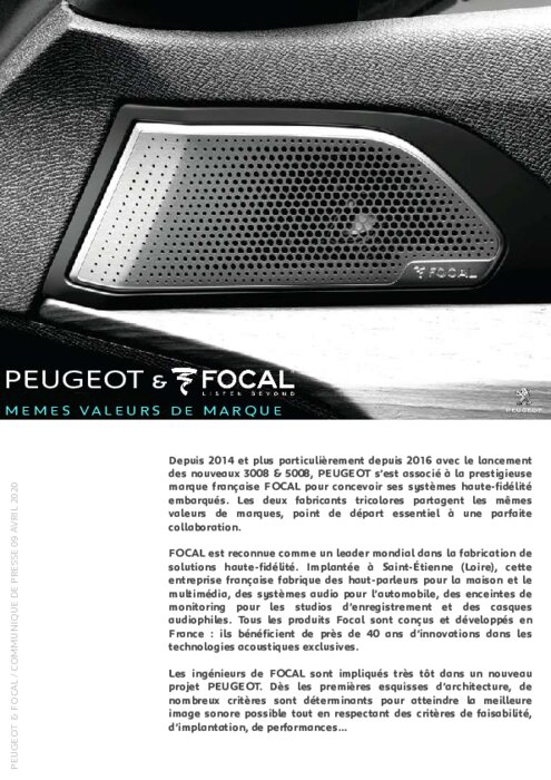 Depuis 2014 et plus particulièrement depuis 2016 avec le lancement des nouveaux 3008 & 5008, PEUGEOT s’est associé à la prestigieuse marque française FOCAL pour concevoir ses systèmes haute-fidélité embarqués. Les deux fabricants tricolores partagent les mêmes valeurs de marques, point de départ essentiel à une parfaite collaboration.