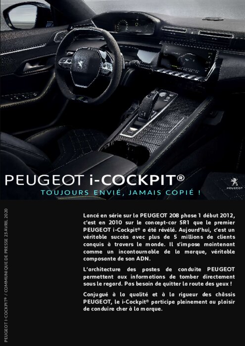 Lancé en série sur la PEUGEOT 208 phase 1 début 2012, c’est en 2010 sur le concept-car SR1 que le premier PEUGEOT i-Cockpit a été révélé. Aujourd’hui, c’est un véritable succès avec plus de 5 millions de clients conquis à travers le monde. Il s’impose maintenant comme un incontournable de la marque, véritable composante de son ADN.