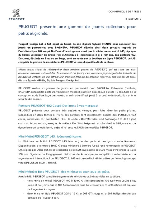 Peugeot Design Lab a fait appel au talent de son styliste Sylvain HENRY pour concevoir ces jouets en partenariat avec BAGHERA. PEUGEOT dévoile ainsi deux porteurs inspirés de l’emblématique 402 coupé Darl’mat d’avant-guerre ainsi que la miniature en métal L45, réplique du bolide vainqueur du Grand Prix d’Amérique à Indianapolis il y a 100 ans. Les porteurs 402 Darl’mat, déclinés en Bleu ou en Beige, sont en vente sur la boutique en ligne PEUGEOT.