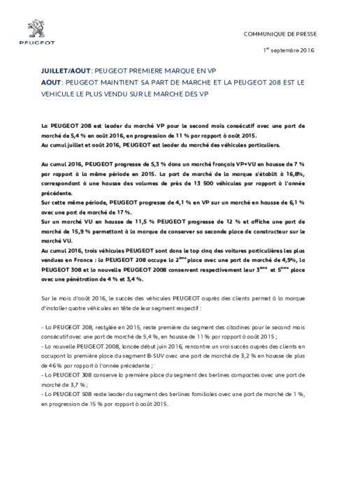 La PEUGEOT 208 est leader du marché VP pour le second mois consécutif avec une part de marché de 5,4 % en août 2016, en progression de 11 % par rapport à août 2015. Au cumul juillet et août 2016, PEUGEOT est leader du marché des véhicules particuliers.