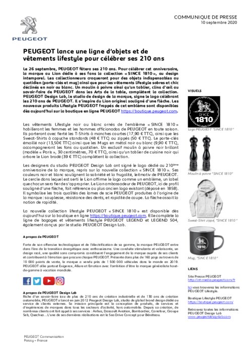 Le 26 septembre, PEUGEOT fêtera ses 210 ans. Pour célébrer cet anniversaire, la marque au Lion dédie à ses fans la collection " SINCE 1810 ", au design intemporel. Les collectionneurs craqueront pour des objets indispensables au quotidien (porte-clés et mug) ainsi que pour les vêtements lifestyle sobres et chic déclinés en noir ou blanc. Un moulin à poivre ainsi qu’un tablier, clins d’œil au savoir-faire de PEUGEOT dans les Arts de la table, complètent la collection.