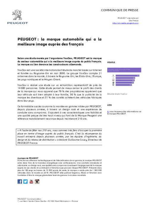 Selon une étude menée par l’organisme YouGov, PEUGEOT est la marque du secteur automobile qui a la meilleure image auprès du public français. La marque au lion devance les constructeurs allemands.