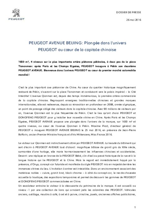 A l'occasion de l'ouverture de l'espace pékinois --le deuxième de ce type dans le monde après un "Peugeot Avenue" sur les Champs-Elysées à Paris--, l'entreprise affiche son intention d'intégrer Dongfeng Peugeot "au top 10 des marques les plus vendues" en Chine.