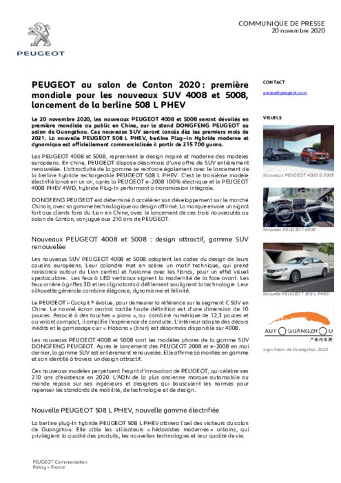Le 20 novembre 2020, les nouveaux PEUGEOT 4008 et 5008 ont été dévoilés en première mondiale au public en Chine, sur le stand DONGFENG PEUGEOT au salon de Guangzhou. Ces nouveaux SUV seront lancés dès les premiers mois de 2021. La nouvelle PEUGEOT 508 L PHEV, berline Plug-In Hybride moderne et dynamique est officiellement commercialisée à partir de 215 700 yuans.