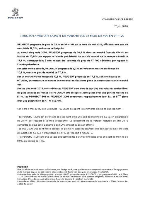 PEUGEOT progresse de plus de 26 % en VP + VU sur le mois de mai 2016, affichant une part de marché de 17,3 %, en hausse de 0,4 point. Au cumul cinq mois 2016, PEUGEOT progresse de 10,5 % dans un marché français VP+VU en hausse de 10,8 % par rapport à l’année précédente. La part de marché de la marque s’établit à 17,1 %, correspondant à une hausse des volumes de près de 17 100 véhicules par rapport à l’année précédente.