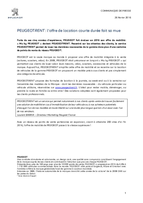 Forte de ses cinq années d’expérience, PEUGEOT fait évoluer en 2016 son offre de mobilité : « Mu by PEUGEOT » devient PEUGEOT RENT. Recentré sur les attentes des clients, le service PEUGEOT RENT permet de louer les dernières nouveautés de la gamme dans plus d’une centaine de points de vente du réseau PEUGEOT.