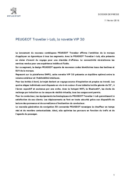 Le lancement du nouveau combispace PEUGEOT Traveller affirme l’ambition de la marque d’appliquer sa dynamique à tous les segments. Avec le PEUGEOT Traveller i-Lab, elle présente sa vision d’avenir du voyage pour une clientèle d’affaires. La connectivité révolutionne les services rendus pour une expérience inédite et fluide. Sur ce segment, le design PEUGEOT apporte de nouveaux codes identitaires issus des berlines et SUV de la marque.