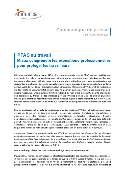 Découvertes à la fin des années 1940 et plus connues sous le nom de PFAS, parfois qualifiées de « polluants éternels », les substances polyfluoroalkylées regroupent plusieurs milliers de composés chimiques utilisés pour leurs propriétés antiadhésives, imperméabilisantes ou encore résistantes à la chaleur. De nombreux salariés y sont exposés tout au long de leur cycle de vie, depuis leur production jusqu’à leur élimination.