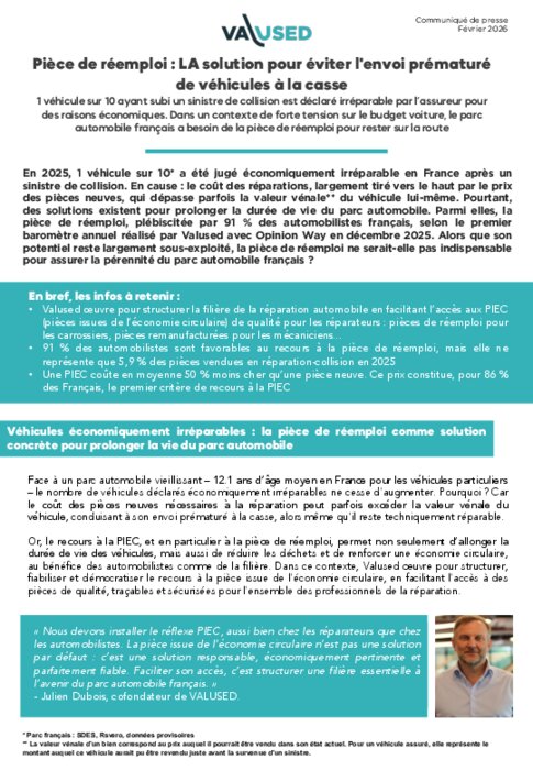 En 2025, 1 véhicule sur 10 a été jugé économiquement irréparable en France après un sinistre de collision. En cause : le coût des réparations, largement tiré vers le haut par le prix des pièces neuves, qui dépasse parfois la valeur vénale du véhicule lui-même. Pourtant, des solutions existent pour prolonger la durée de vie du parc automobile. Parmi elles, la pièce de réemploi, plébiscitée par 91 % des automobilistes français, selon le premier baromètre annuel réalisé par Valused avec Opinion Way en décembre 2025. Alors que son potentiel reste largement sous-exploité, la pièce de réemploi ne serait-elle pas indispensable pour assurer la pérennité du parc automobile français ?