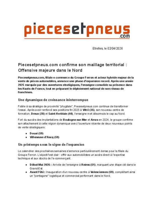 Piecesetpneus.com, filiale e-commerce du Groupe Ferron et acteur hybride majeur de la vente de pièces automobiles, annonce une phase d’expansion record. Après une année 2025 marquée par des ouvertures stratégiques, l’enseigne consolide sa présence dans les Hauts-de-France, tout en préparant le déploiement national de son réseau de franchises.
