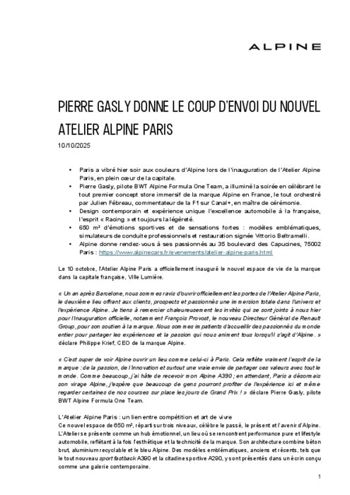 Paris a vibré aux couleurs d’Alpine lors de l’inauguration de l’Atelier Alpine Paris, en plein cœur de la capitale. Pierre Gasly, pilote BWT Alpine Formula One Team, a illuminé la soirée en célébrant le tout premier concept store immersif de la marque Alpine en France, le tout orchestré par Julien Fébreau, commentateur de la F1 sur Canal+, en maître de cérémonie. Design contemporain et expérience unique l’excellence automobile à la française, l’esprit « Racing » et toujours la légèreté. 650 m² d’émotions sportives et de sensations fortes : modèles emblématiques, simulateurs de conduite professionnels et restauration signée Vittorio Beltramelli.