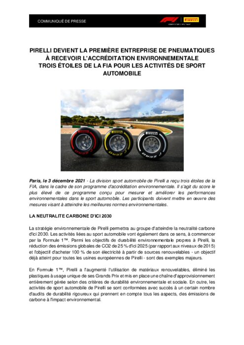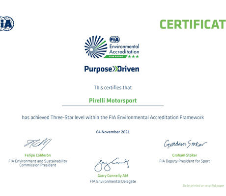 La division sport automobile de Pirelli a reçu trois étoiles de la FIA, dans le cadre de son programme d'accréditation environnementale. Il s'agit du score le plus élevé de ce programme conçu pour mesurer et améliorer les performances environnementales dans le sport automobile. Les participants doivent mettre en œuvre des mesures visant à atteindre les meilleures normes environnementales.