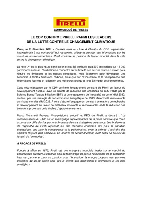 Classée dans la « liste A Climat » du CDP, organisation internationale à but non lucratif qui rassemble, diffuse et promeut des informations sur les questions environnementales, Pirelli confirme sa position de leader mondial dans la lutte contre le changement climatique.