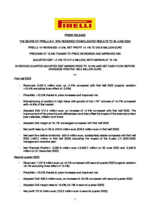 Au premier semestre, Pirelli a vu son bénéfice net augmenter de 4,1%, à 242,6 millions d'euros, alors que son chiffre d'affaires s'est accru de 7,5%, à 3,43 milliards d'euros, selon des résultats publiés jeudi.