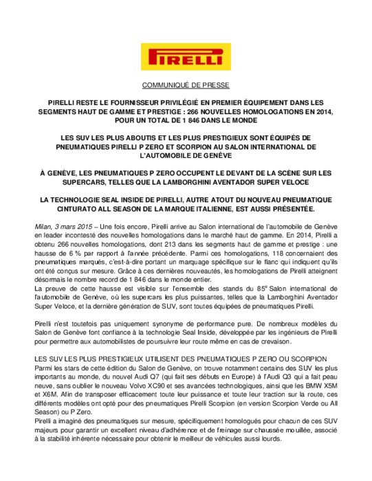 PIRELLI à l’occasion de sa présence au Salon International de l’automobile de Genève
